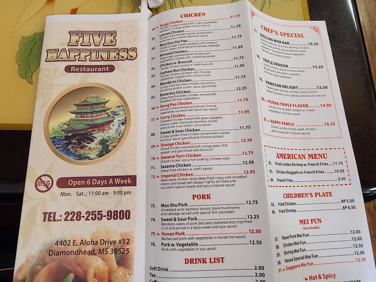 Welcome to Five Happiness, a delightful eatery located in Diamondhead, Mississippi, where dining translates to absolute satisfaction. The menu showcases a range of traditional Chinese dishes, each prepared with care and authenticity. Customers rave about the General Tso's Chicken, praised for its juicy quality and flavorful punch, while the spring rolls are hailed as the most delicious to be found anywhere.